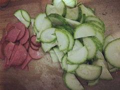2. 角瓜炒肉:将角瓜切片,猪肉切丝。热锅凉油,先下肉丝翻炒至变色,再加入角瓜片,加入适量生抽、老抽、盐、鸡精等调味料,翻炒均匀即可。
